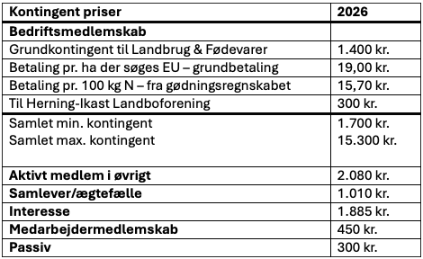 Kontingent til landboforening opkræves en gang årligt i februar måned. Når du er medlem i Herning-Ikast Landboforening er du også automatisk medlem af Landbrug & Fødevarer. I nedenstående skema ses hvorledes kontingentet er sammensat. Informationerne vi bruger til at beregne kontingentet for bedriftsmedlemmer henter vi fra gødningsregnskabet og ansøgningen om enkeltbetaling. Hvis du mener dit kontingent bliver beregnet forkert er du meget velkommen til at kontakte vores sekretariat.